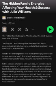 JUNE 2023. In this week’s episode I chat with Julie Williams, looks at family energies and how the family soul is impacted through ancestral suffering. We consider how we take on the suffering of our ancestors, why this happens and how it impacts upon us. We discuss how we can heal ancestral suffering and also the shadow elements. Julie’s approach to this shows us how we can take our true place in our family container and live our true purpose. Available on all podcast platforms