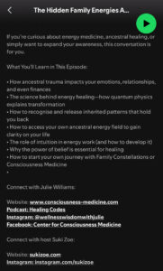 “Join me as I interview the amazing Julie Williams and her Journey into Consciousness Medicine. In this episode, Julie Williams highlights the difference between traditional medicine, which relies on observable and statistically significant evidence, and quantum physics, which explores the science of subatomic levels. She discusses how quantum physics provides an explanation for the effectiveness of subtle energy healing techniques, such as the power of intention, prayer, and meditation, in promoting healing.”